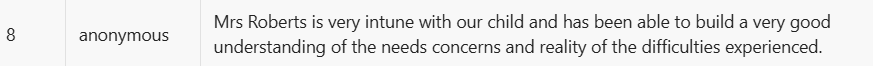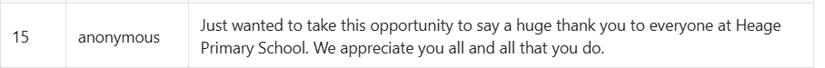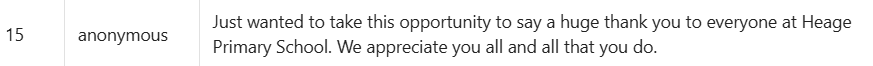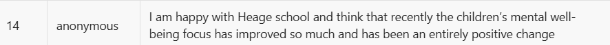 Lots of positive changes. Love the introduction of the dojo app & getting to see photos & greater communication about what the children have been doing. Strong positive leadership is evident. The children talk about the school values at home, so they are really embedded & I really like that the school focusses on the children's overall wellbeing, not just education. Also, like the emotional check-in, as this early focus on awareness of their own emotions is really important in supporting their wellbeing & ability to manage their emotions as they grow up. Anonymous