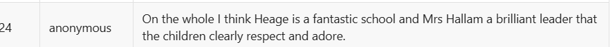 The Headteacher and Deputy are a great team. Mrs Robert's long-standing commitment to the school alongside Mrs Hallam's leadership has enabled change for the good. There is now better communication; forest school time for all; more clubs. Mrs Hallam is always present and approachable, as is Mrs Roberts. Anonymous